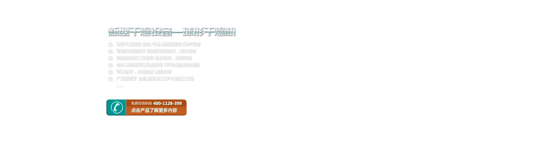 球形干燥設備 混合.干燥.清洗無死角.GMP設備 可加熱貼面攪拌 另加安裝破碎刀,減少結塊 較高的有效工作容積 混合均勻,沒有死角 物料.清洗液可以完全排盡 CIP在線全方位清洗 可以全開,方便檢查 清洗方便 廣泛適用于 食品.醫藥.化工 等干燥加工行業 設備模擬流程 設備選型 技術參數 HCQG球形干燥機